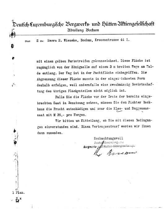 Hiermit erkläre ich mich bereit, das zwischen Bahn und Rechenerwald gelegene Gelände zum Preise von 45 Pfg. fünfundvierzig Pfennig per Rute an den Schrebergartenverein zu verpachten. Der Pachtpreis ist per Jahr zu verstehen.
