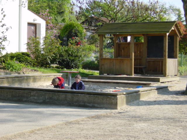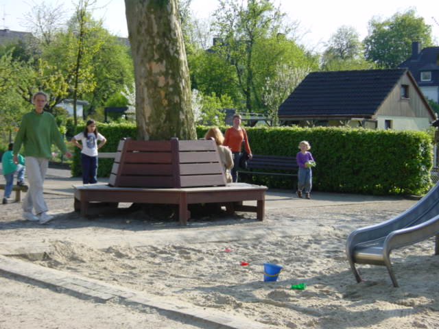Eine von den Mitgliedern gebaute Rundbank um eine der alten Platanen ist der Mittelpunkt des Platzes. Neben einem kindgerechten Spielhaus und einem Kletterturm mit Rutsche finden die Kinder hier einen Balancierbalken, ein vielseitiges Klettergestell, eine Tischtennisplatte, einen Spieltisch, einen großen und einen kleinen Sandkasten sowie zwei Wackeltiere.